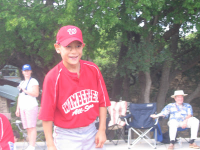 1st Inning: We were home, so Mas opened up pitching (3 batters/11 pitches/1 strike-out). His second batter hit a pop fly, which was subsequently thrown to 1st base for a double play. Mas struck the next batter out, and no run for Comfort. Offensively, P and Mat walked; J got to second; S and Dr struck out; Da walked; Samuel got to first (He had a great hit on the first pitch; unfortunately, the camera wasn't ready so we have no video.); and Mas hit a pop fly. P, Mat, and J crossed home plate. SCORE: 3-0.